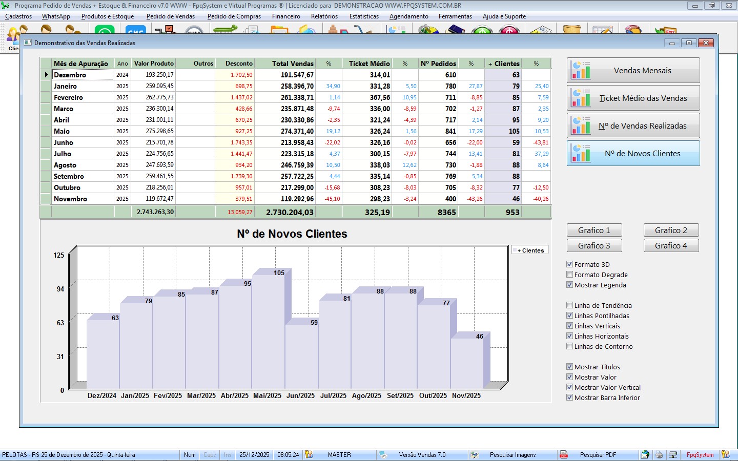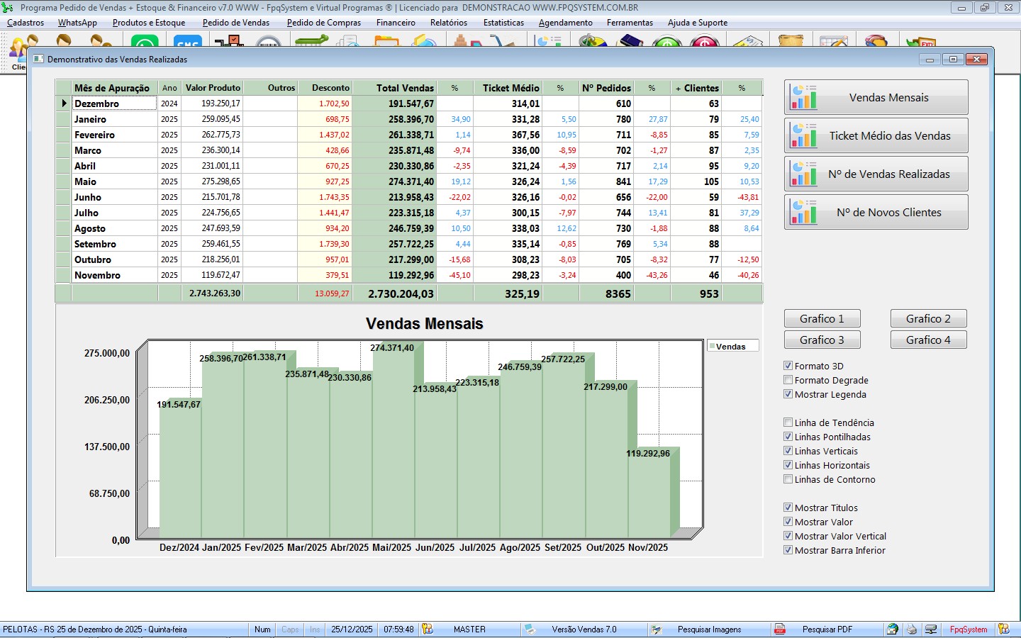 Permite analisar em gráfico, faturamento mensal ou anual.